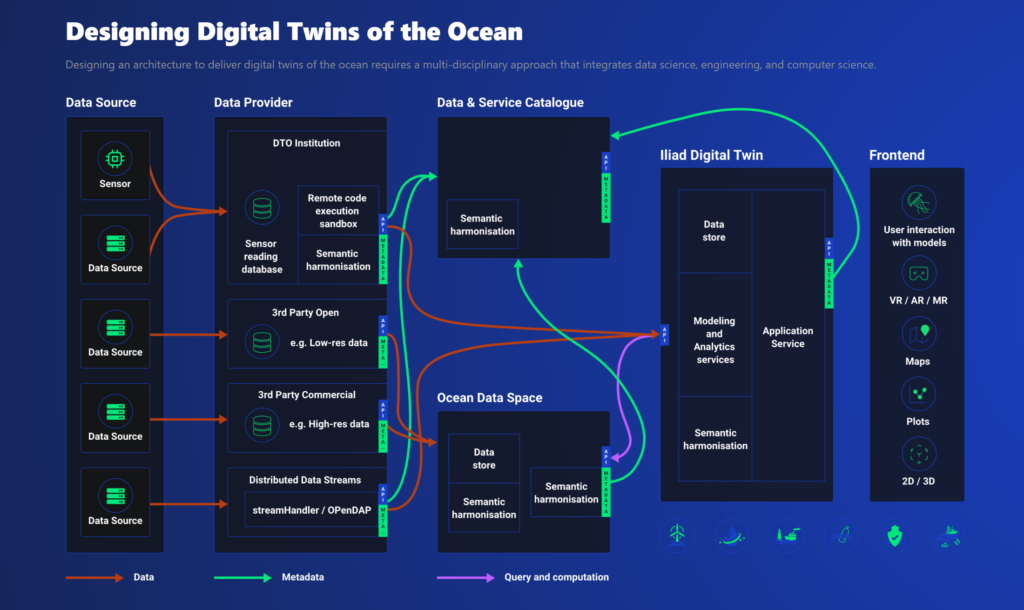 This type of architecture allows digital twins not only to address questions about the present state (What now?), the past (What in the past?), and forecasts and simulations (What future? and What if?) of the ocean, but also to interact with other digital twins (What else?), accessing external data and models that may influence or be influenced by the scenarios under analysis.